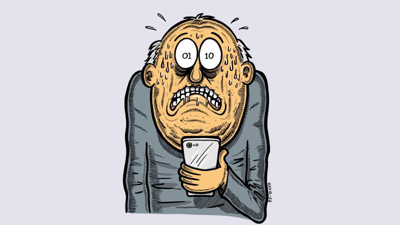 Samtidspsykos! - Mentala psykbryt i en digital tid Satirteckningar som speglar skarpt samtidsaktuella frågor om samhälle och maktordning.