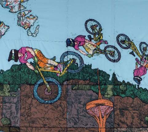 soloutställning »Berättelsen tar aldrig slut«. Träsnitt på textil.